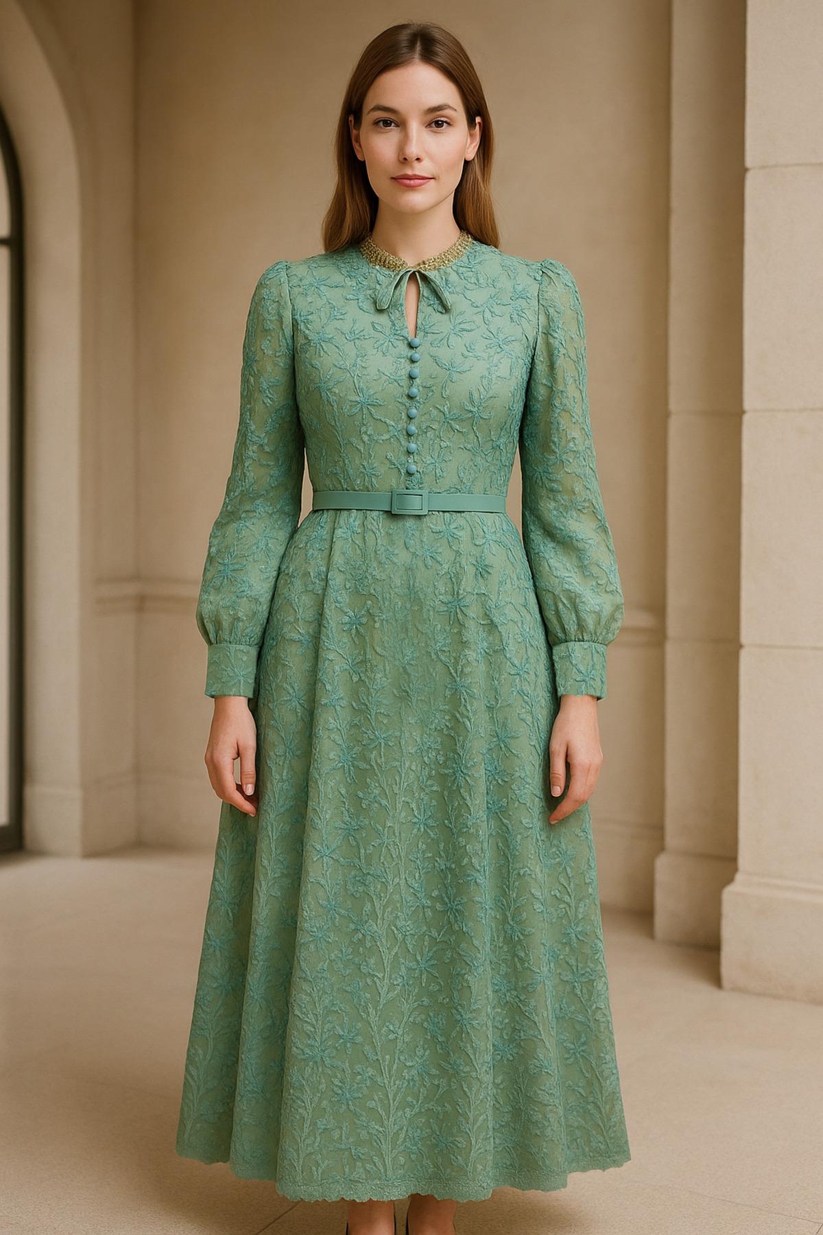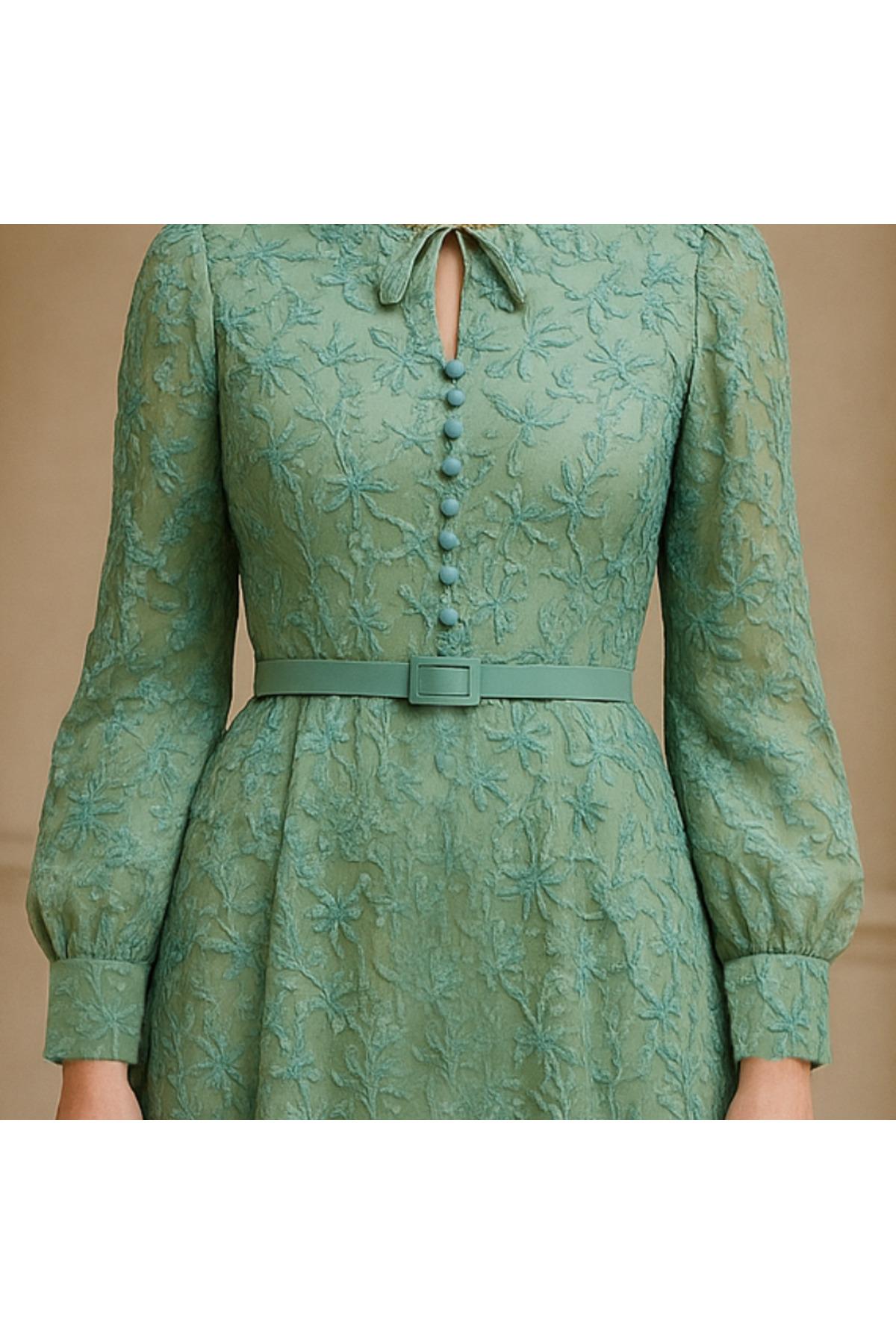 Zarif ve romantik detaylarıyla ön plana çıkan bu yeşil elbise, şıklığı ve konforu bir arada sunar.; Tamamı dantel işlemeli kumaşıyla özel bir dokuya sahip olan model, önde yer alan düğme detayları ve ince kemeriyle bel hattını vurgular.; Uzun kollu ve astarlı tasarımı sayesinde dört mevsim kullanım imkânı sağlar.; Klasik ama etkileyici görünümüyle davetlerden günlük zarif kombinlere kadar her ortamda göz alıcı bir tarz yaratır.; Modern “A-line” kesimi, vücut hatlarını dengeleyerek zarif bir siluet oluşturur.; - Şık ve zarif tasarımıyla düğün ve nikah gibi özel günlerde göz alıcı bir görünüm sunar.; - Fermuarlı kapama şekli, kolay giyilip çıkarılmasını sağlar ve pratik kullanım imkanı tanır.; - Balon kol detayı ile feminen bir hava katar ve hareket özgürlüğü sunar.; - A-line silueti sayesinde vücut hatlarını nazikçe sararak zarif bir duruş sergiler.; - Dantel materyali, sofistike bir dokunuşla elbisenin zarafetini artırır.; - Uzun kollu tasarım, mevsim geçişlerinde ideal konforu sağlar ve şık bir görünüm kazandırır.; - Çiçek desenli yapısıyla bahar ve sonbahar aylarının ruhunu yansıtırken, modaya uygun bir stil sunar.; - Boyundan bağlamalı yaka tipi ile kişisel zevke göre ayarlama imkanı tanır ve farklı kombinasyonlara olanak sağlar.; - Kemer detayları bel bölgesini vurgulayarak feminen silueti daha da ön plana çıkarır.; - Midi boyu ile hem rahatlık hem de şıklığı bir arada sunarak her adımda konfor sağlar.; - İç göstermeyen astarlı yapısı sayesinde rahatlıkla tercih edilebilen
