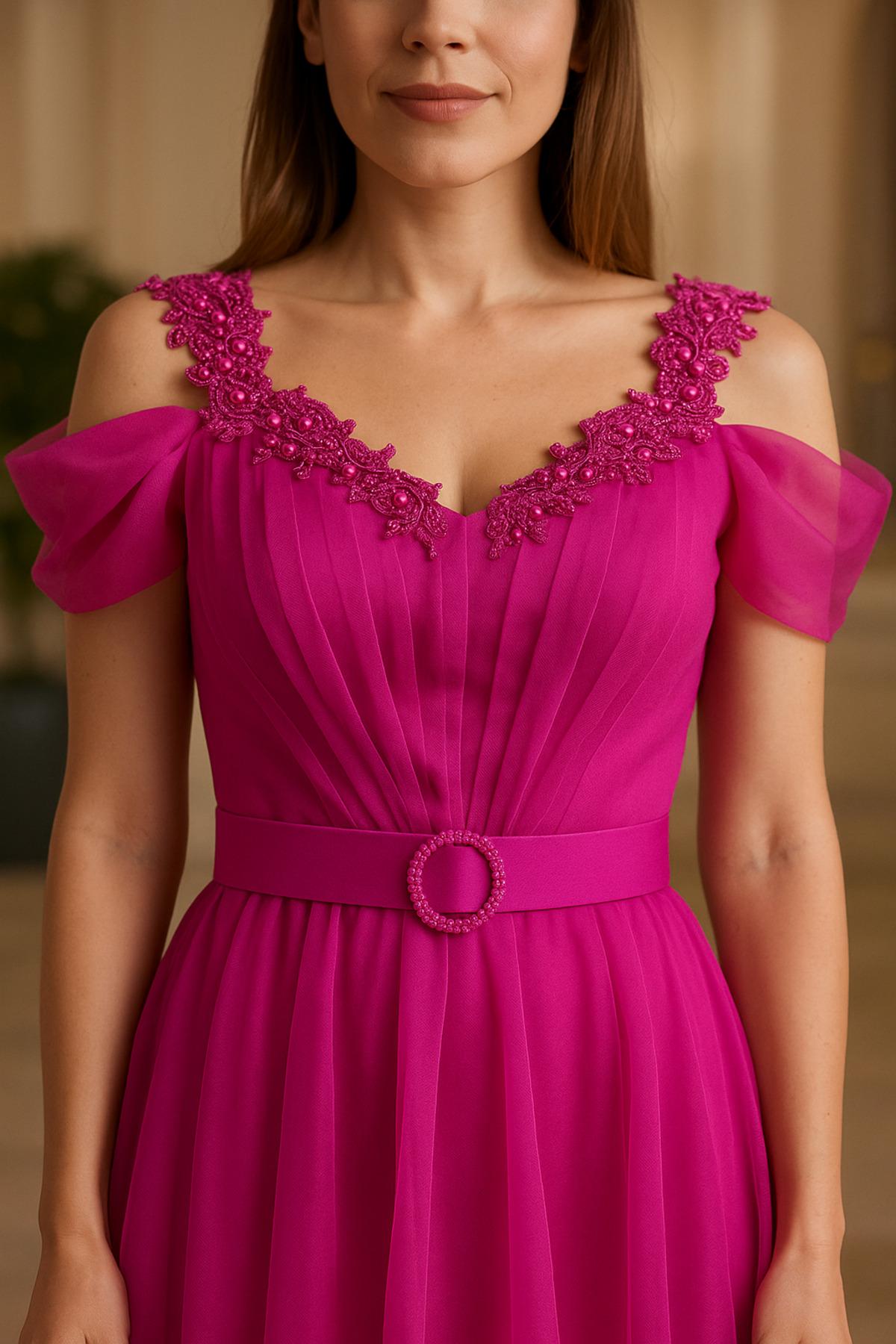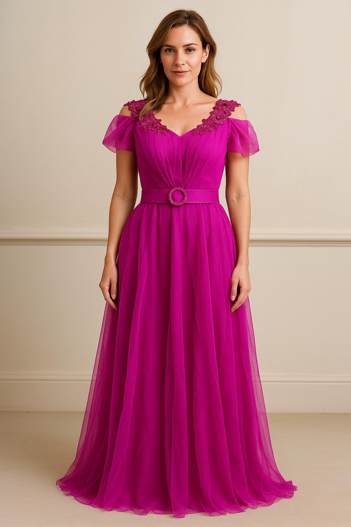 Omuzlarında el işçiliği çiçek işlemeleri bulunan bu zarif model, dökümlü tül kumaşıyla romantik bir şıklık sunar.; Drapeli gövde tasarımı ve taş tokalı kemeriyle bel hattını vurgular.; Yumuşak astarı sayesinde iç göstermeyen konforlu bir kullanım sağlar.; Düşük kol formu, elbiseye zarif bir omuz detayı kazandırırken, uzun tül eteği akıcı bir siluet oluşturur.; Özel günler, davetler ve nişan organizasyonlarında modern ve zarif bir tercih oluşturur.; - Zarif V yaka tasarımı ile feminen bir görünüm sunar.; - Şık ve gece ortamları için ideal, A-line silueti ile vücut hatlarını zarifçe sarar.; - Düşük kol detayları, rahat hareket etme özgürlüğü sağlar.; - Astarlı yapısı sayesinde iç göstermeyen konforlu bir kullanım sunar.; - Düz deseniyle sade ve şık bir tarz yaratır; çiçek aksesuarları ile feminen dokunuşlar ekler.; - Kemer detayı belinizi vurgulayarak zarif bir görünüm kazandırır.; - Regular kalıp ile rahat bir kullanım sağlar; her vücut tipine uyum sağlar.; - Kısa kollu tasarımı, mevsim geçişlerinde idealdir.; - Fermuarlı kapama şekli pratik kullanım imkanı sunar.; - Düğün/Nikah gibi özel günlerde tercih edebileceğiniz şık ve modern bir seçimdir.; - Türkiye menşeli olup, kaliteli işçilikle üretilmiştir.; - Uzun boyu ile hem şıklığı hem de rahatlığı bir arada sunar.;