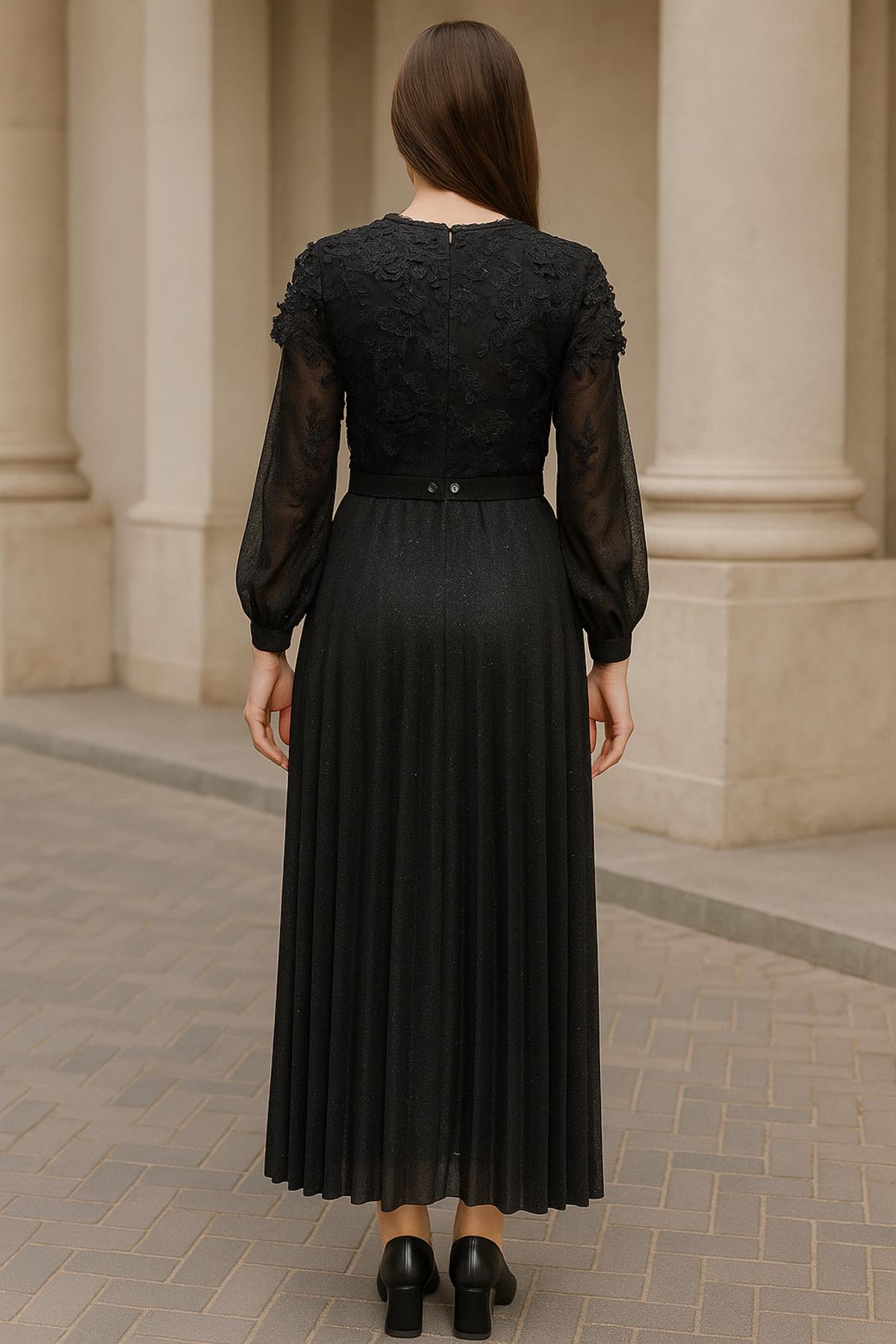 Zarafetiyle öne çıkan bu siyah elbise, üst kısmındaki dantel işlemeleri ve ışıltılı alt eteğiyle dikkat çeker.; Şifon etek kısmı hafif dökümlü yapısıyla feminen bir siluet oluştururken, V yaka ve inci düğme detayları modele klasik bir zarafet katar.; Kemerli tasarımı bel hattını vurgularken, uzun kolları ve tam astarlı yapısı dört mevsim şıklık sunar.; Davet, nişan, mezuniyet gibi özel günlerde şıklığınızla fark oluşturun.; - Mezuniyet ve balo gibi özel günlerde şıklığınızı tamamlayacak V yaka dantel işlemeli simli kumaş elbise.; - Uzun kollu tasarımı ile mevsim geçişlerinde de rahatlıkla tercih edebileceğiniz bir stil sunar.; - A-line silueti sayesinde vücut hatlarınıza zarif bir şekilde oturur ve feminen bir görünüm sağlar.; - Fermuarlı kapama şekli, kolay giyilip çıkartılmasını ve pratik kullanım sunar.; - Şifon dokuma tipi, hafif ve akıcı bir yapıya sahip olup hareket özgürlüğünüzü kısıtlamaz.; - İncili detaylar ile zenginleştirilmiş deseniyle göz alıcı bir etki yaratırken, çiçekli desen ise romantik bir hava katar.; - Kemerli tasarımı belinizi vurgulayarak daha ince bir görünüm kazandırır.; - Astarlı yapısı sayesinde iç göstermeyen konforlu kullanım imkanı sunar.; - Uzun boyu ve long fit kalıbı ile modern ve şık bir siluet çizerken, cepsiz tasarım minimalist estetiği destekler.; - Türkiye'de üretilmiş olup, yerli